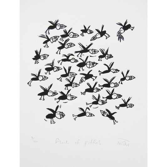 Flock of Puffins Art Lino Cut Print